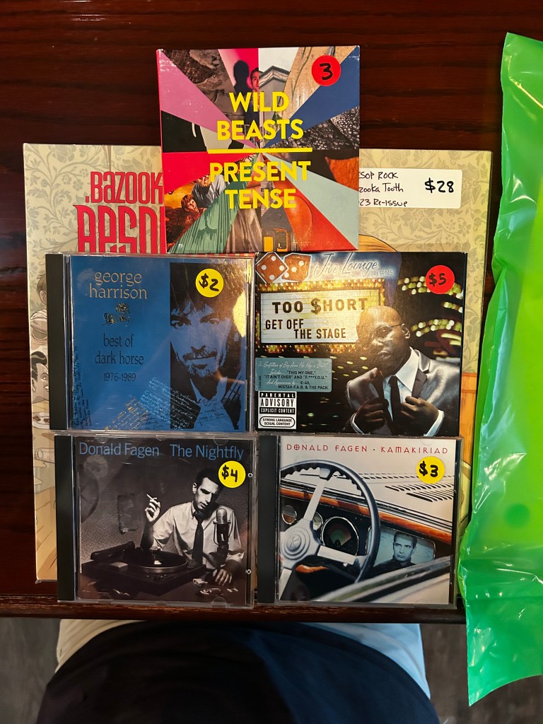 Also of note were two Donald Fagen solo discs that I had never heard, a Wild Beasts’ Present Tense CD, a vinyl copy of The Doobie Brothers’ Takin’ It To The Streets. and a George Harrison Best Of Dark Horse compilation. Seven wildly diverse finds that perfectly reflect the eclecticism of this tiny shop.